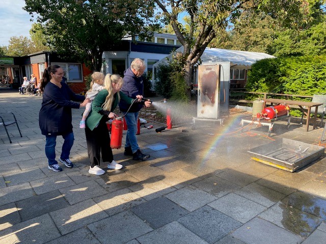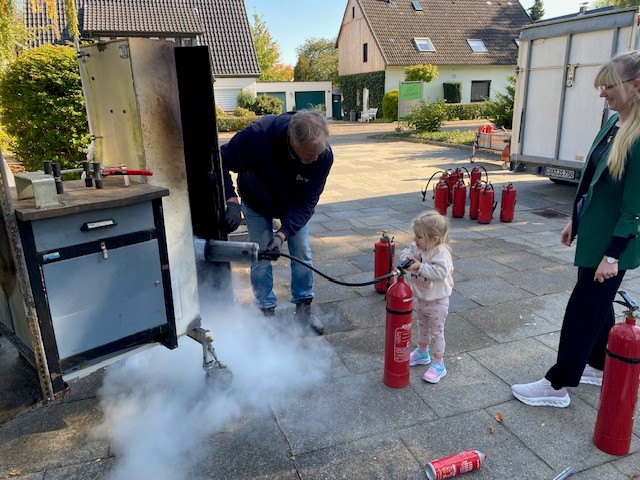 Nach dem theoretischen Teil folgten praktische Übungen, bei denen verschiedene Brandszenarien realitätsnah dargestellt wurden. Unter fachkundiger Anleitung konnte jeder Teilnehmende den richtigen Umgang mit dem Feuerlöscher üben und das Gelernte direkt anwenden.