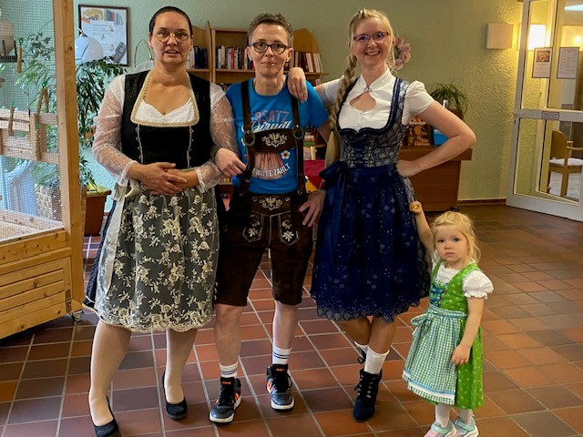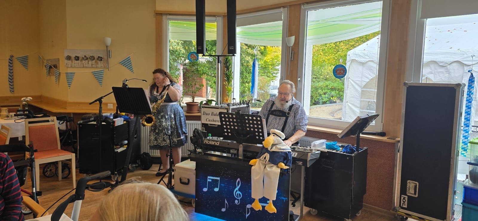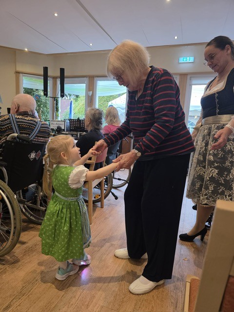 Unsere Mitarbeiterinnen und Mitarbeiter, stilecht in Tracht gekleidet, sorgten mit einer fröhlichen Aufführung zum Lied „Unsere Tante aus Marokko“ für ausgelassene Stimmung. Damit leiteten sie perfekt in den musikalischen Nachmittag mit dem DUO BALANCE über. Das Duo begeisterte mit abwechslungsreicher Musik und erfüllte die Musikwünsche unserer Bewohnerinnen und Bewohner. Bald wurde mitgesungen, geschunkelt und gelacht – ganz im Sinne echter bayerischer Gemütlichkeit.
